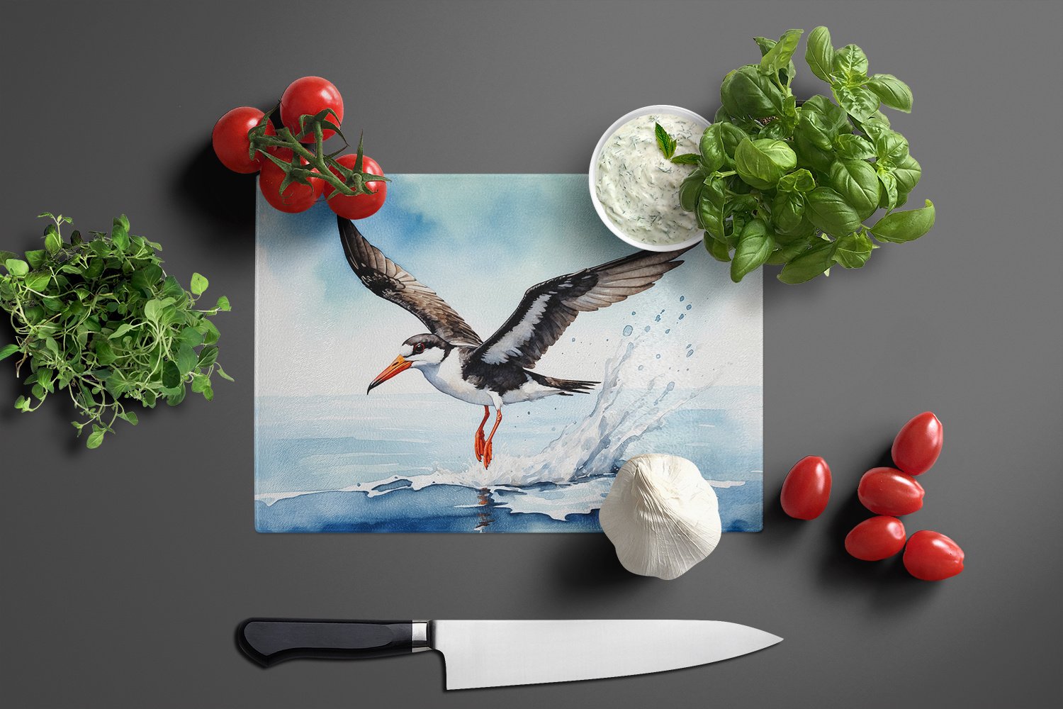 Glass Cutting Board featuring breed specific Black Skimmer artwork. Introduce your kitchen to the vibrant, large Decorative Glass Cutting Board from Caroline's Treasures. Crafted from resilient tempered glass, this board is not only a utilitarian necessity but also a colorful art piece. With its generous dimensions of 15 inches in height and 12 inches in length, it offers ample space for all your cutting needs. Every piece showcases captivating artwork from distinguished artists, bringing an aesthetic edge to your kitchen. Beyond its attractive design, this cutting board ensures your countertop stays pristine and unscathed, owing to its heat-resistant properties. Engineered with user convenience in mind, it features non-skid feet for stability, and rounded corners for additional safety. Its robust construction renders it virtually unbreakable, guaranteeing longevity. The board comes with protective feet bumpers, maintaining its position during use. This product is recommended to be hand washed only. Proudly printed and assembled in the United States, this cutting board exemplifies superior craftsmanship. With Caroline's Treasures' Decorative Glass Cutting Board, you're investing in a blend of functionality and artistic flair.
