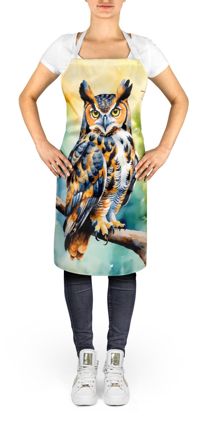 Apron featuring breed specific Great Horned Owl artwork. Elevate your cooking, baking, and grilling experiences with our versatile Kitchen or BBQ Apron. This Bib Style apron isn't just limited to culinary activities - it also serves as an excellent baking apron, artist apron, server apron, gardening apron, or even a dog grooming apron. The apron showcases vibrant full-color artwork contributed by one of our talented artists, bringing a dash of style to your daily tasks. With dimensions of approximately 27"W x 30"H, it provides ample coverage to protect your clothing from spills and splashes. Our apron is meticulously crafted from 100% Ultra Spun Polyester, known for its durability and lightweight nature. The apron comes with white tie straps, ensuring a comfortable and adjustable fit for all. It's a perfect choice for kitchen apron enthusiasts, whether you are a woman or a man. Designed for easy maintenance, this apron is fully machine washable. The quick-drying polyester material actively reduces staining, keeping your apron looking fresh and new for longer. Our beautifully designed apron isn't just a functional kitchen accessory - it's a fashion statement in the culinary world!