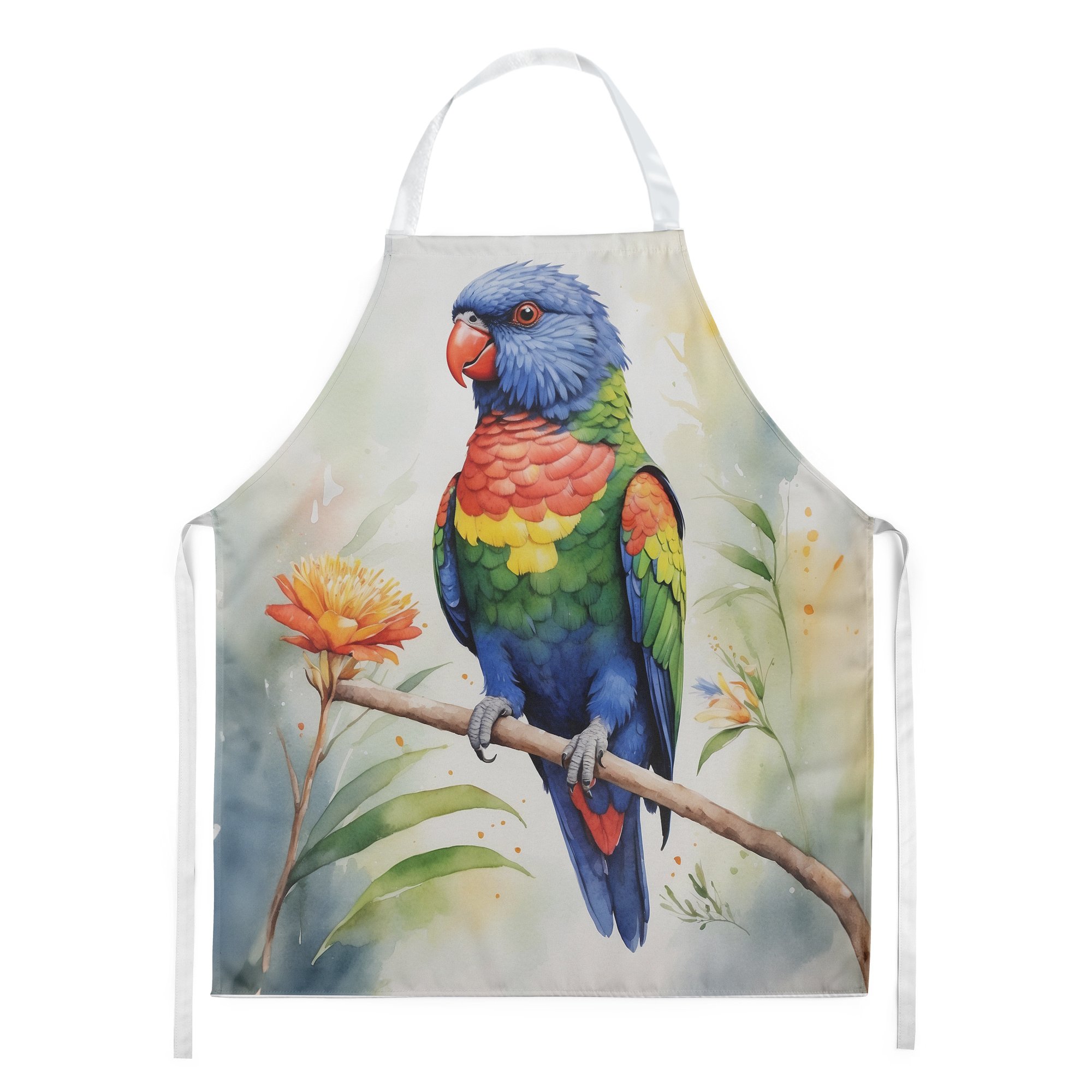 Apron featuring breed specific Rainbow Lorikeet artwork. Elevate your cooking, baking, and grilling experiences with our versatile Kitchen or BBQ Apron. This Bib Style apron isn't just limited to culinary activities - it also serves as an excellent baking apron, artist apron, server apron, gardening apron, or even a dog grooming apron. The apron showcases vibrant full-color artwork contributed by one of our talented artists, bringing a dash of style to your daily tasks. With dimensions of approximately 27"W x 30"H, it provides ample coverage to protect your clothing from spills and splashes. Our apron is meticulously crafted from 100% Ultra Spun Polyester, known for its durability and lightweight nature. The apron comes with white tie straps, ensuring a comfortable and adjustable fit for all. It's a perfect choice for kitchen apron enthusiasts, whether you are a woman or a man. Designed for easy maintenance, this apron is fully machine washable. The quick-drying polyester material actively reduces staining, keeping your apron looking fresh and new for longer. Our beautifully designed apron isn't just a functional kitchen accessory - it's a fashion statement in the culinary world!